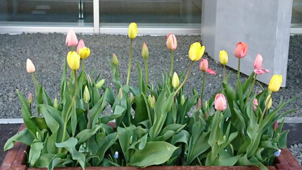 E棟事務室の前にチューリップを植栽したプランターがあるのをご存じでしょうか。