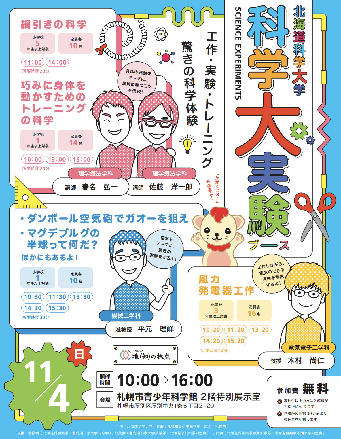 北海道科学大学では、昨年度から文部科学省の「地(知)の拠点大学による地方創生事業(COCプラス)」の一環として、札幌市青少年科学館との共催による“科学大実験”イベントを開催しています。