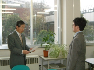 平成17年5月17日(火)同窓会室にて人工衛星開発(HitSATプロジェクト)への特別助成交付式が行われ、小林敏道会長より佐鳥新先生へ特別助成交付書が授与されました。