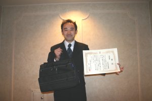 左写真は経営工学科の早川智昭くん、右写真は建築工学科の石井孝典くん、賞品はノートパソコン用バッグでした。