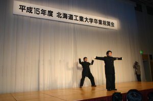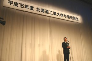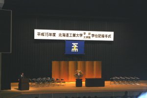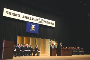 平成16年3月18日13:00より北海道厚生年金会館にて学位記授与式が行われ、工学部の機械工学科34期卒139名、経営工学科34期卒79名、電気工学科33期卒150名、応用電子工学科15期卒98名、土木工学科29期卒96名、建築工学科29期卒153名、学部総数715名(9月卒業者を含めると730名)、および大学院工学研究科の機械工学システム専攻博士課程8期修了2名、機械工学システム専攻修士課程11期修了9名、電気工学専攻修士課程13期修了7名、応用電子工学専攻修士課程13期修了12名、土木工学専攻修士課程11期修了5名、建築工学専攻修士課程13期修了9名、大学院総計44名に対し学位記が授与されました。