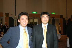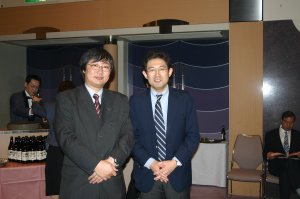 写真は鈴木幹事と小松先生、右写真は石田幹事と川端幹事(ネクタイが良く似ています! 情報デザインの二人は色違いのレジメンタル、社会基盤は黄色系のお揃い、ネクタイも学問に関係するのでしょうか?)