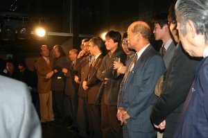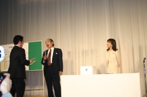 全教員がステージ上に並べられ、各ゼミ代表者から花束、寄せ書き色紙およびビデオレターCD-ROMが贈呈されました(武田先生! なぜお一人だけお酒持参?)。