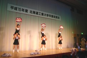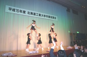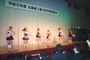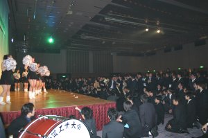 卒業祝賀会で最も盛り上がるプログラム、HITを胸に付けた工大チアリーダーがエネルギッシュ&スマイルで卒業生への餞の演技を行いました。右下写真のように、この演技のときはステージ前に群衆が押し寄せ、思い思いにチアリーダーとの楽しいひとときを過ごしておりました。