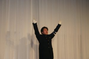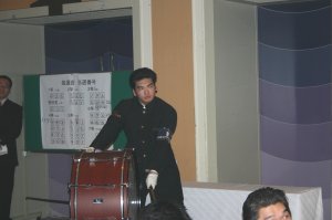 華やかなチアリーダー演技に続いて、工大男児たる応援団による演舞が行われ、団長の北畠弘晶くんから卒業生へエールが送られました。