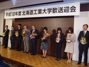 今年度は退職された学長と教員計5名に、大学レターヘッド入りの特製ガラス楯を4月1日(土)に行われた北海道工業大学歓送迎会にて贈呈いたしました。また、退職された契約職員と転出異動された職員へフラワーアレンジメントを贈りました。歓送迎会の様子を掲載いたします。