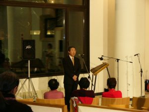 受付でご来場者にアンケートと温かい飲み物をお配りしまし、同窓会 小林会長(写真右下)の挨拶によりコンサートが始まりました。