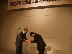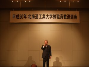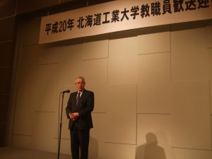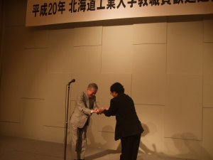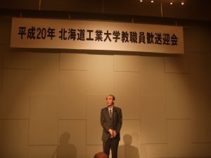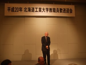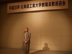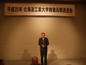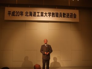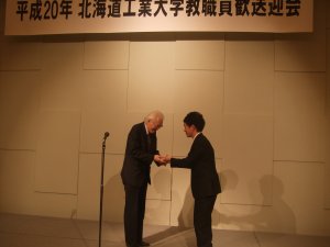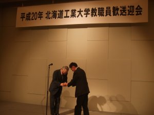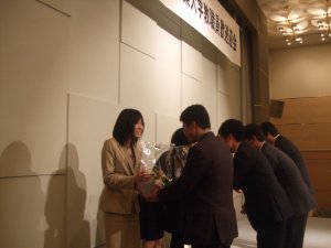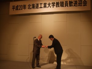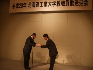 平成20年4月2日(水)に行われた稲嶺会の歓送迎会にて退職された先生に記念楯を贈呈しました。また、退職された契約職員と転出異動された職員へフラワーアレンジメントが同窓会幹事より手渡されました。