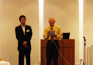 総会後に平成22年度同窓会賞(雪嶺賞)授賞式が行われ、今年度の受賞者機械工学科5期の吉岡匠さんと建築工学科7期の小松幸雄さんに小林会長より賞状、楯、記念品が贈られました。