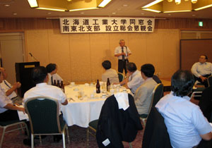 青森支部および秋田支部に引き続き、岩手県、宮城県、山形県、福島県在住の同窓生を対象とした東北圏内で3番目となる南東北支部の設立総会が、平成22年8月27日にホテルメトロポリタン仙台にて開催されました。当日は、神谷光彦教授、白濱芳朗教授、田沼吉伸教授を始め7名の教員のご臨席を賜ったほか、小林同窓会長、青森支部長、秋田支部長、そして多くの同窓生に参加して頂いたことで、大変盛大な会となりました。