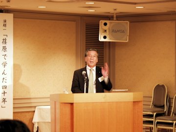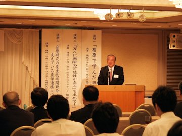 総会後に平成25年度同窓会賞(雪嶺賞)授賞式が行われ、今年度の受賞者 機械工学科1期の敦賀一草さん、機械工学科2期の畑原雅裕さん、機械工学科22期の笹島学さんの3名に、小林会長より賞状、楯、記念品が贈られました。授賞式後、記念講演をしていただきました。