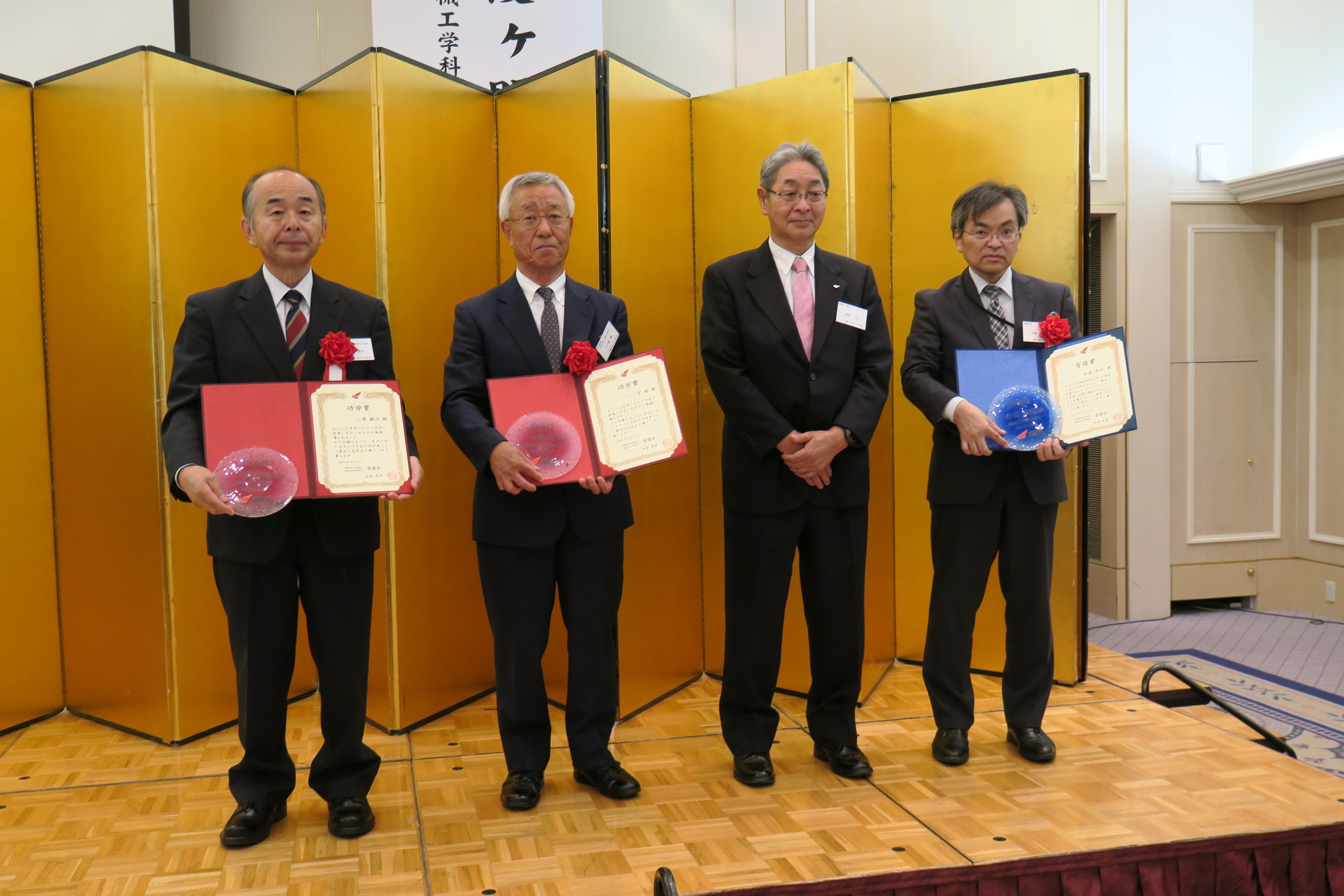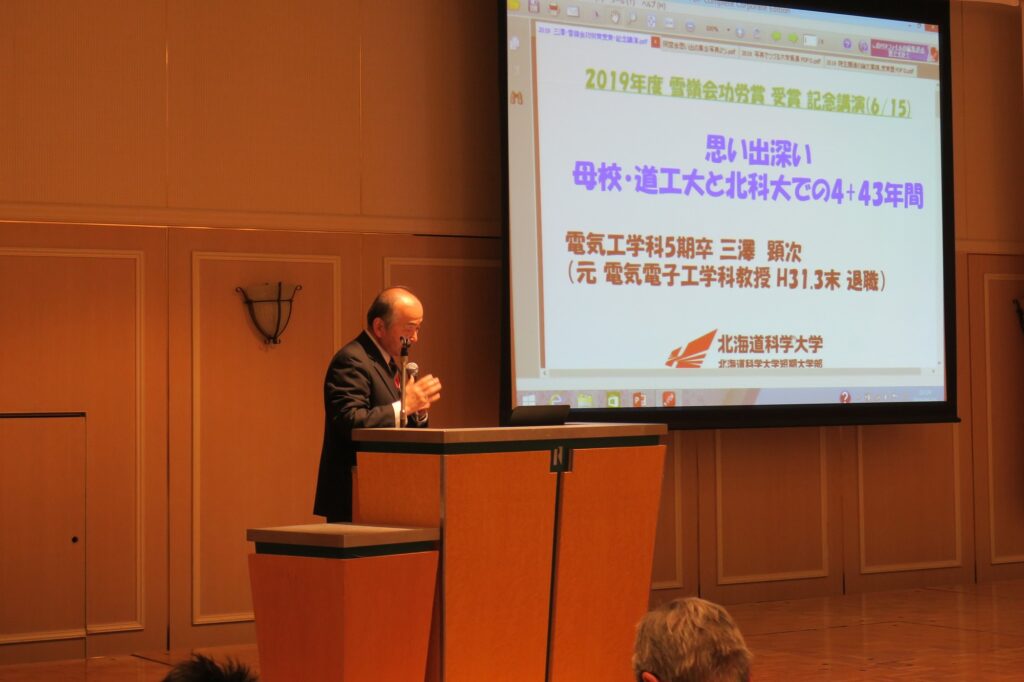 2019年度は、一ノ宮 修先生(機械工学科4期)・三澤 顕次先生(電気工学科5期)に功労賞が、中島 和弘さん(機械工学科13期)に雪嶺賞が贈られました。