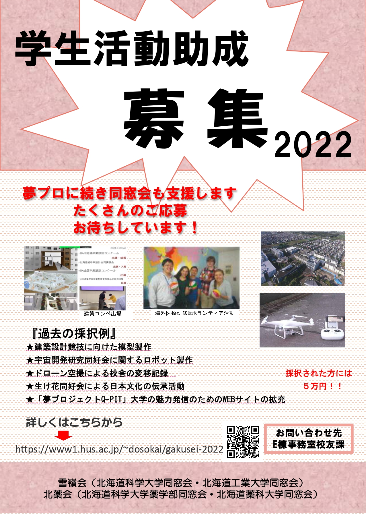 雪嶺会・北薬会では、北海道科学大学の学生の諸活動を支援することを目的として「学生活動助成」を行っています。