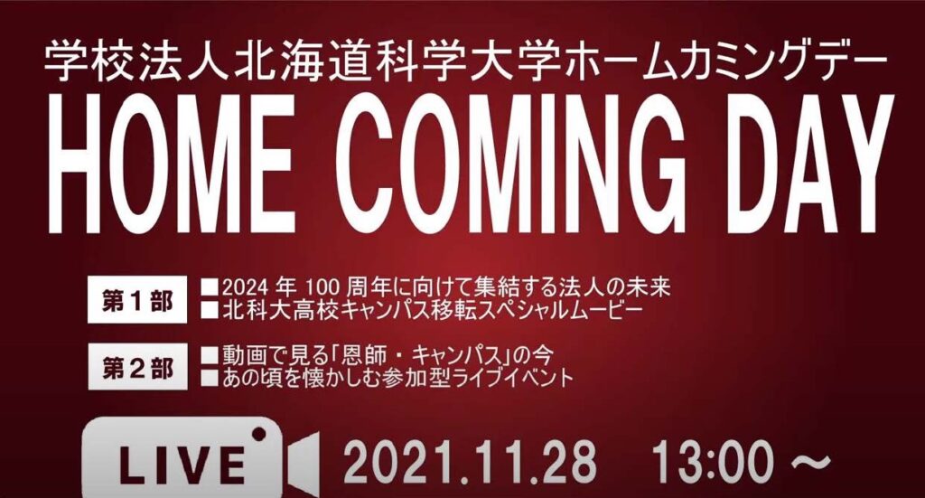 2021年11月28日(日)、学校法人北海道科学大学オンラインホームカミングデーが開催されました。 学校法人オンラインホームカミングデー ホームカミングデー概要 これまで、雪嶺会・北薬会・丁酉会の共催で大学祭に合わせて開催してきた『ホームカミング...