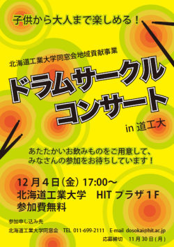 2009年12月4日、今年度で開催が2回目となる、同窓会の地域貢献事業を大学HITプラザにて行いました。 地域貢献事業 ドラムサークルコンサート 2009年12月4日、今年度で開催が2回目となる、同窓会の地域貢献事業を大学HITプラザにて行いました。地域住民の...