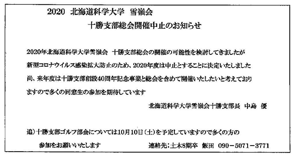 2020年度「雪嶺会総会」中止のお知らせ