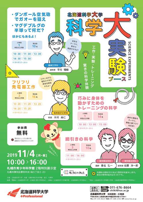 2019年11月4日(月・祝)に札幌市青少年科学館において北海道科学大学『科学"大"実験ブース』を開催します。 詳細情報 北海道科学大学では、文部科学省の「地(知)の拠点大学による地方創生事業(COCプラス)」の一環として、2017年から札幌市青少年科学館と...