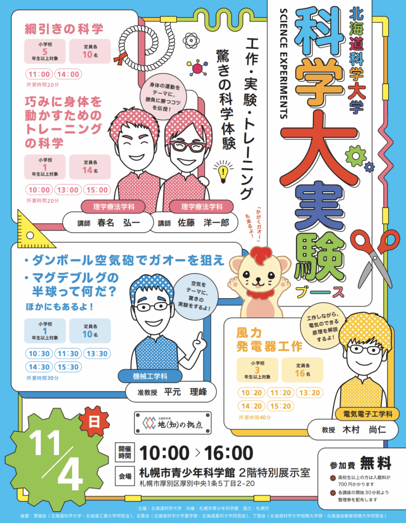 平成30年11月4日(日)、札幌市青少年科学館にて「科学"大"実験ブース」を開催します。 詳細情報 北海道科学大学では、昨年度から文部科学省の「地(知)の拠点大学による地方創生事業(COCプラス)」の一環として、札幌市青少年科学館との共催による“科学大実...