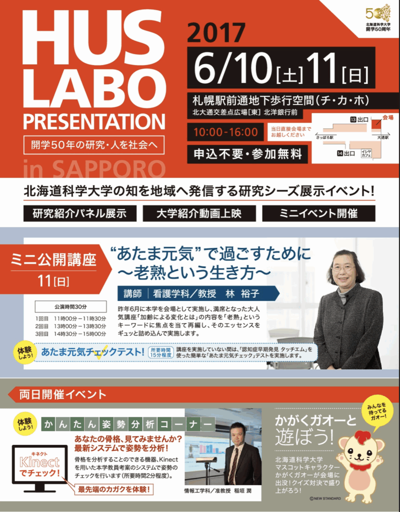 チ・カ・ホでミニ公開講座&研究パネル展示イベントを開催します 詳細 今年度、北海道科学大学の研究成果を地域に発信するイベント「HUS LABO」を全道3ヶ所で行います。今回は、その第1弾のご案内です。 北海道科学大学研究シーズ展示イベン...