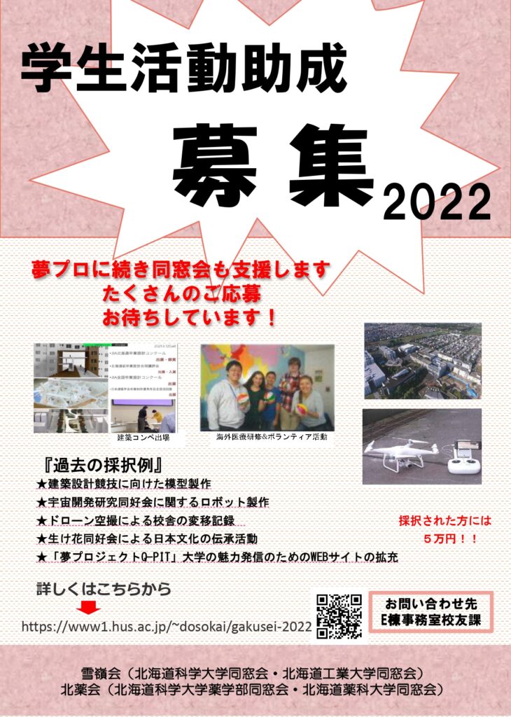 雪嶺会・北薬会では、北海道科学大学の学生の諸活動を支援することを目的として「学生活動助成」を行っています。 詳細情報 正課外の諸活動に意欲的な学生あるいは学生団体に対し、選考の上、活動助成金を支給しますので、みなさまふるってご応募下さい。...