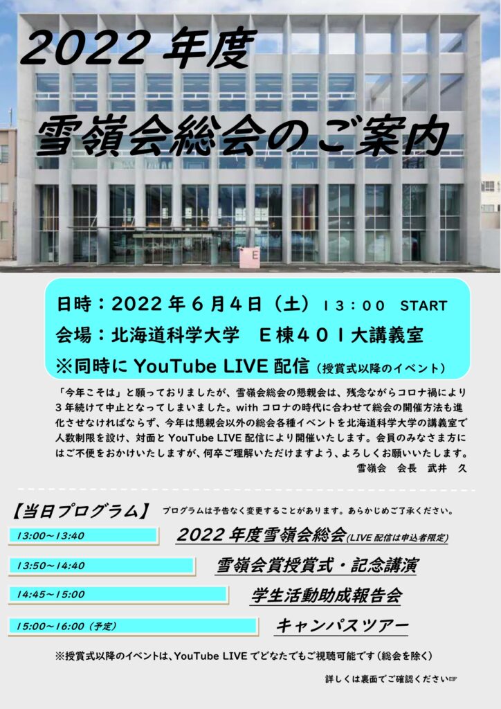 6月4日(土)雪嶺会総会・雪嶺会賞授賞式・学生活動助成報告会・キャンパスツアーが開催されました。ご来場のみなさま、ありがとうございました。 2022年度雪嶺会総会 コロナ禍のこの2年、雪嶺会総会は定例幹事会を総会代行とし、書面でのご報告とさせて...
