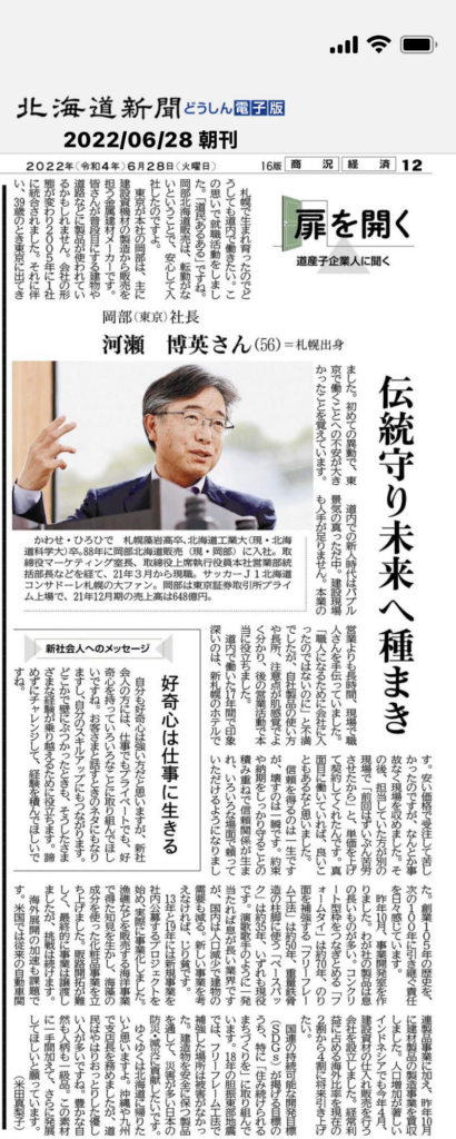 岡部株式会社の代表取締役社長でいらっしゃる河瀬 博英さん(機械18期)が北海道新聞に掲載されました。 詳細情報 岡部株式会社社長の河瀬博英さんのインタビューが、ふるさと北海道の『北海道新聞』(2022.6.28朝刊)に掲載されました。『扉を開く・...